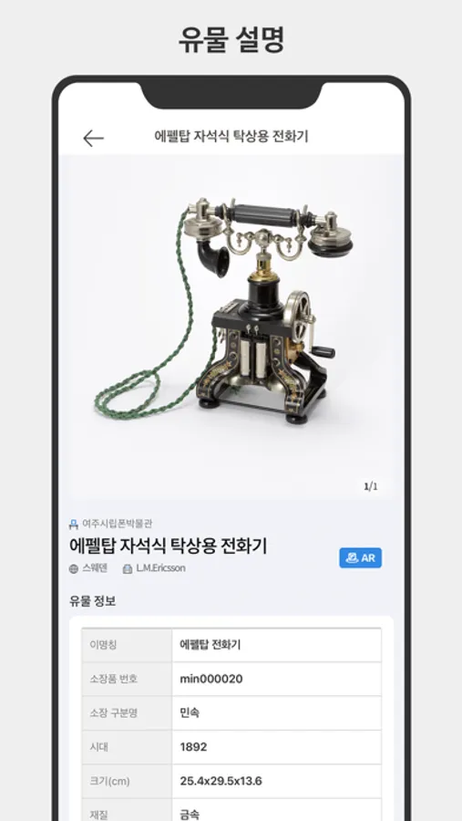 유물 설명을 통해 자세한 정보를 얻을 수 있으며, 3D 스캔한 유물을 AR 콘텐츠로 좀 더 가깝게 즐길 수 있습니다.