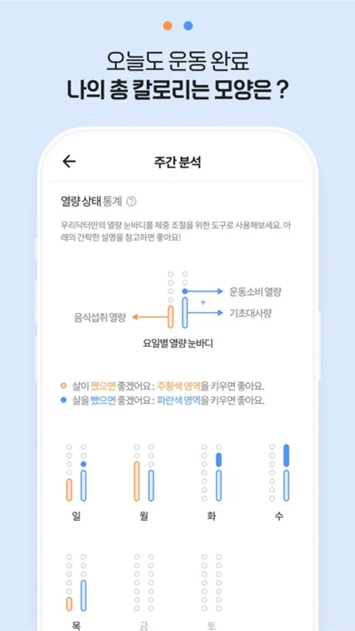기초대사량부터 나의 활동 정도와 운동에 따른 칼로리 소비를 바로 알 수 있어요.