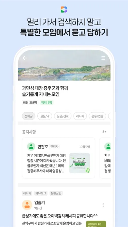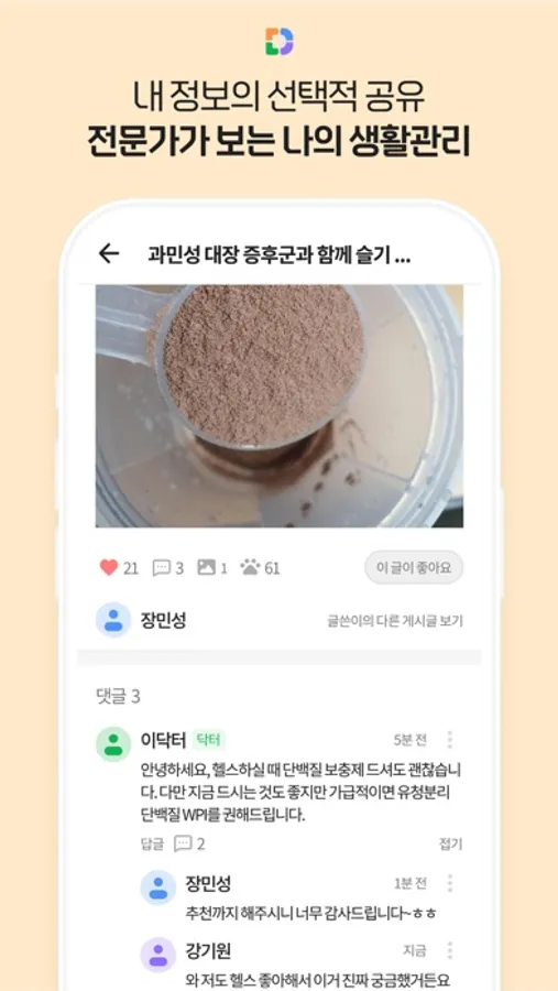 식이/운동/수면/질환 생활 속 필요한 건강 정보를 다 모았어요. 또한 궁금한 것이 생기면 커뮤니티에서 전문가에게 물어보며 도움을 받을 수 있어요.