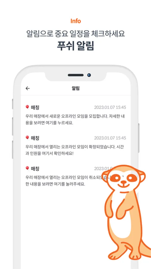 - 우리 매장에서 신규 모임이 만들어지면 푸시 알림을 발송해 드립니다.
