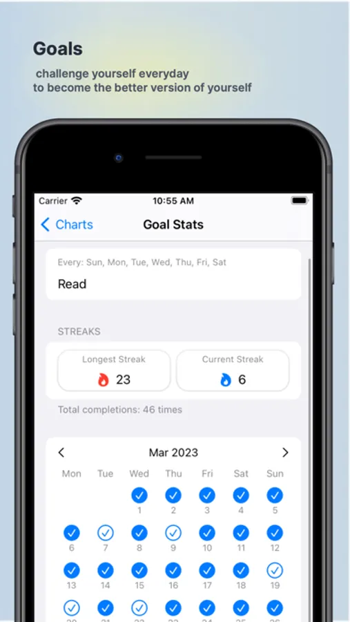 - Goals: Create & customize new goals and challenge yourself everyday to become the better version of yourself