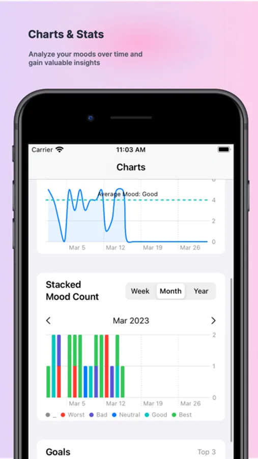- Charts and stats: Stay in tune with your emotions and mental health. Use the Charts and Stats to analyze your moods over time and gain valuable insights and self-reflect on what you did & achieved