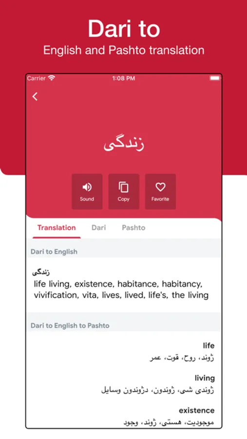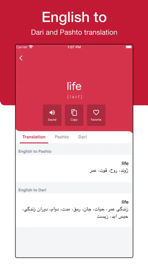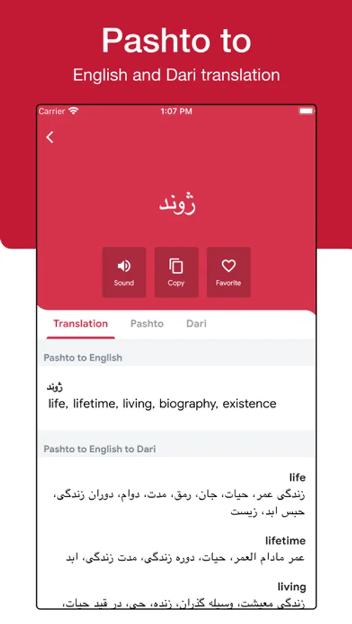 With Qamoos you can search by one of three languages(Pashto, Dari, or English) and get the translation in the other two languages.