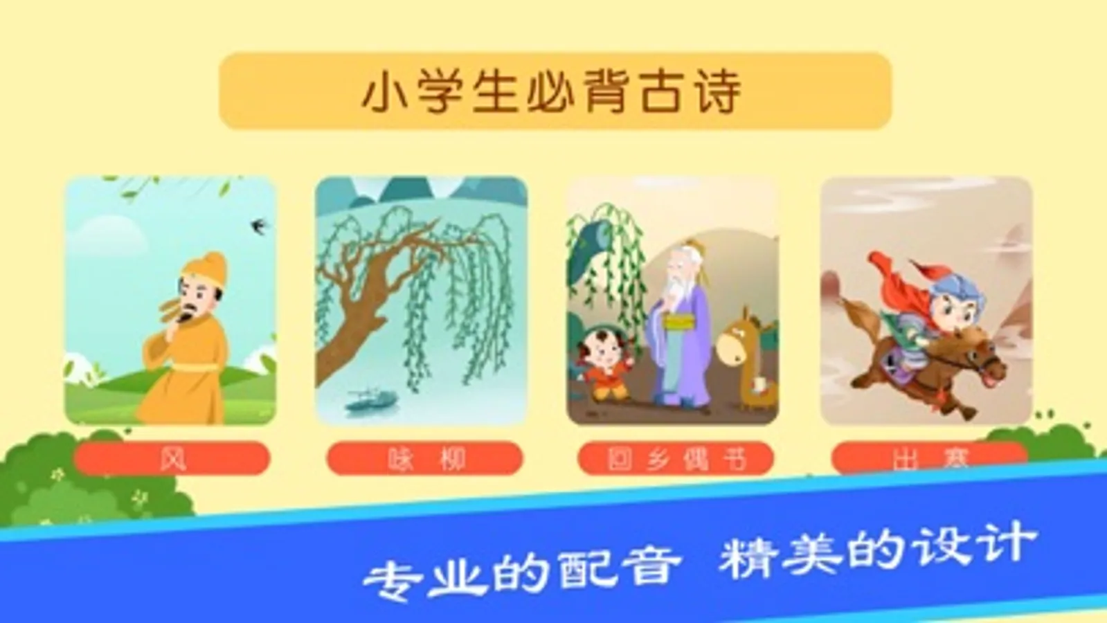 《咏鹅》,《春晓》,《望庐山瀑布》,《赠汪伦》,《枫桥夜泊》,《悯农》,《敕勒歌》,《静夜思》,《绝句》,《鹿柴》,《出塞》,《登鹳雀楼》,《芙蓉楼送辛渐》,《凉州词》,《九月九日忆山东兄弟》,《宿建德江》,《望天门山》,《回乡偶书》,《寻隐者不遇》,《早发白帝城》,《清明》,《观书有感》,《春日》,《送元二使安西》,《小池》,《江雪》,《黄鹤楼送孟浩然之广陵》, 《咏柳》,《乐游原》,《凉州词》,《江南春》,《秋夕》,《游子吟》,《竹石》,《赠花卿》,《题临安邸》,《浪淘沙》,《石灰吟》,《己亥杂诗》,《江南》,《长歌行》,《七步诗》,《风》,《从军行》,《竹里馆》,《古朗月行》,《独坐敬亭山》,《秋浦歌》,《别董大》等等。