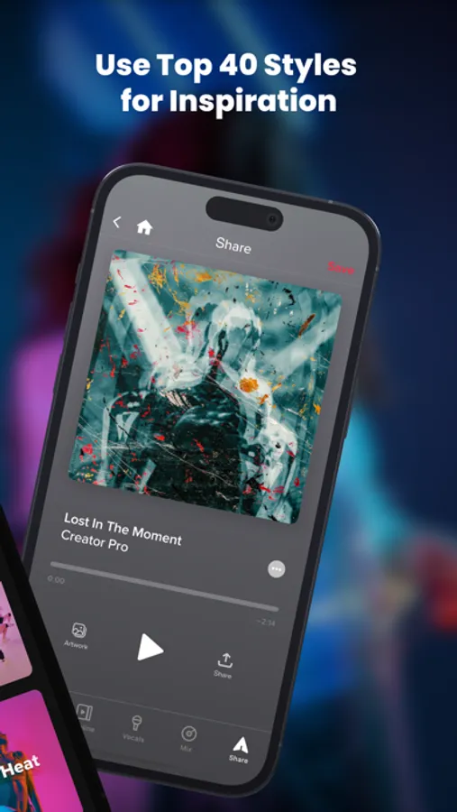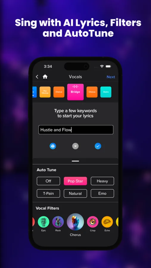 Still working out your rhymes? Just give Creator a few words about your song and the AI engine will write lyrics for you. Give your voice a boost with AutoTune and Filters and you’re ready to record…