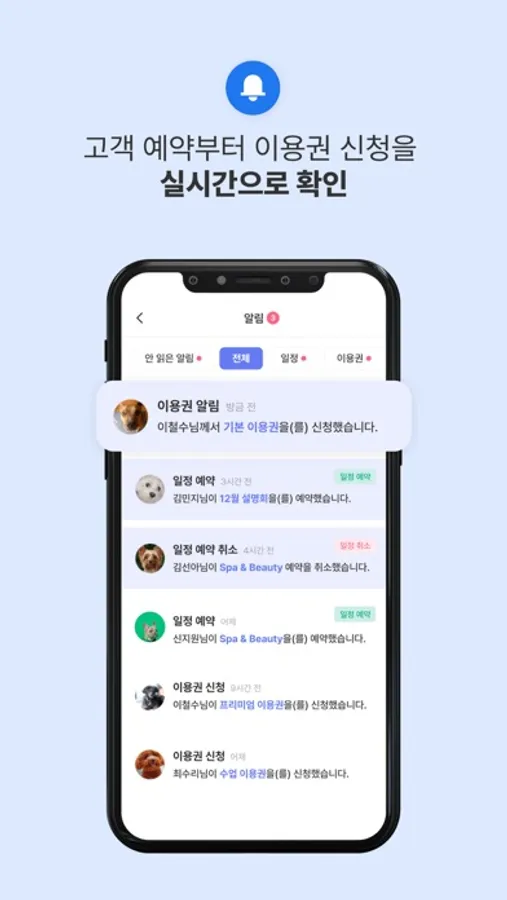 ●일정 예약, 취소, 이용권 신청 알림을 실시간으로 받아볼 수 있어요.