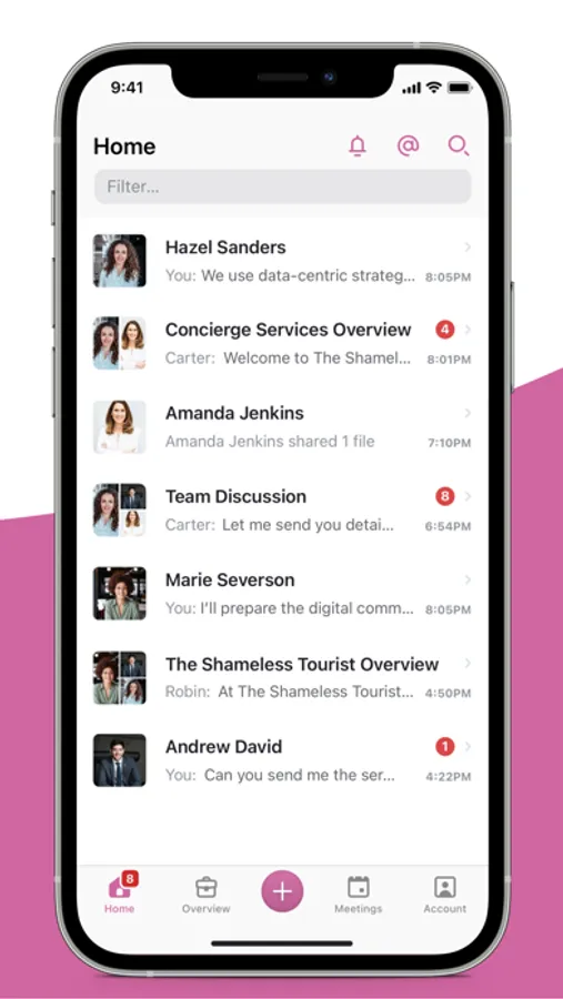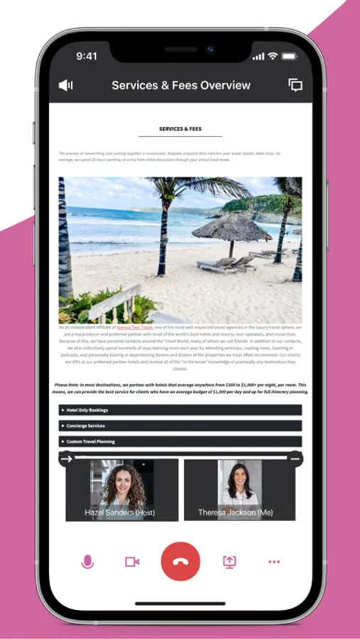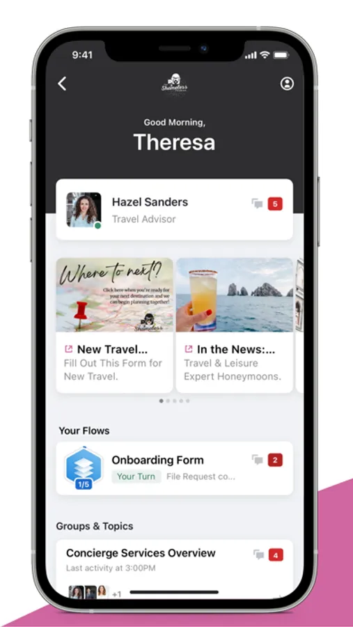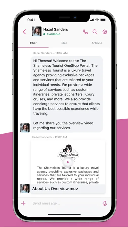 The Shameless Tourist App allows you to view your travel itinerary and connect with our team throughout the planning process. Stay up-to-date with capabilities such as secure messaging, video conferencing, calendar management, real-time notifications, document sharing, and more — all within the app.