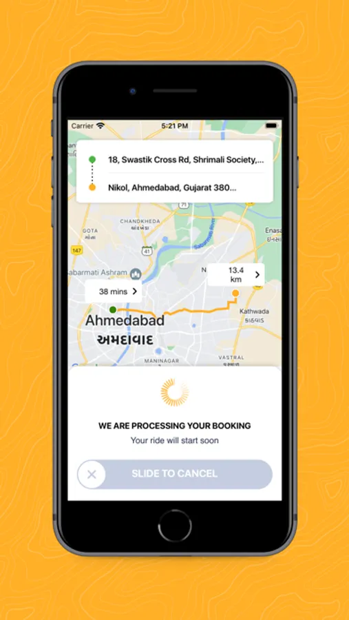 This app allows the passenger to book a cab by providing pickup and destination location, the passenger can also choose the type of cab (normal cab) (electric cab).