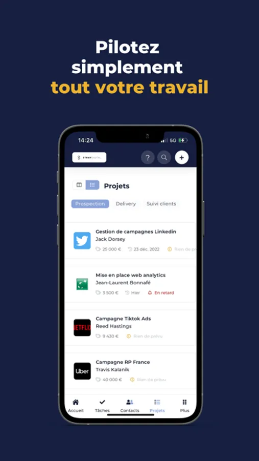 Hubflo regroupe tout le nécessaire pour gérer votre entreprise : prospection, facturation, projets, finances, emails...