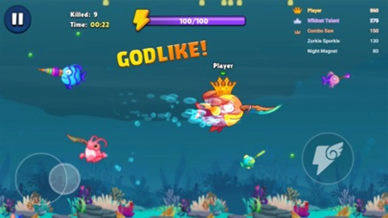 - Try not to be destroyed by bigger fish and be the last survivor in the sea battle