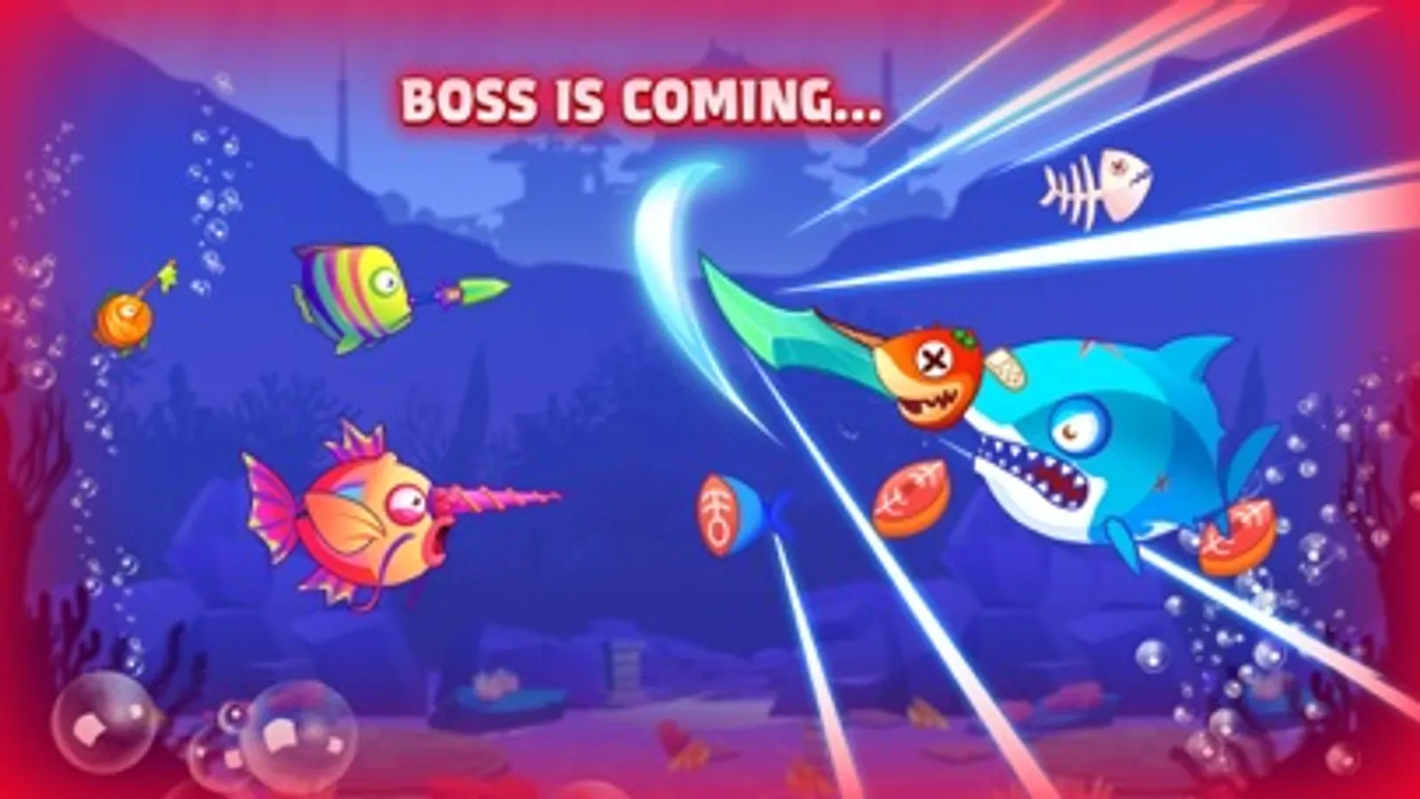 To become the king of the blue ocean, you must be the biggest. Attack, shoot fish and cook other fish to become bigger. In the end, you get to eat the big boss fish. Dominate the sea and become the strongest hunter. Expand your fishing grounds and crush all opponents!