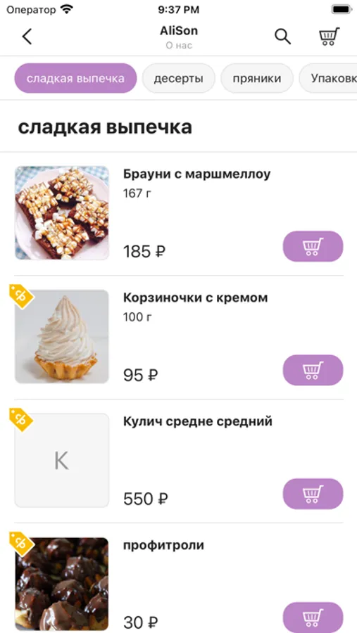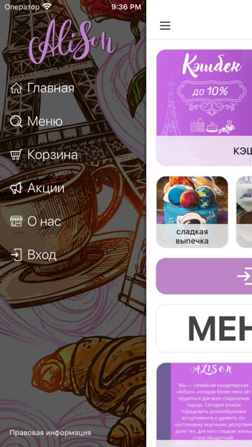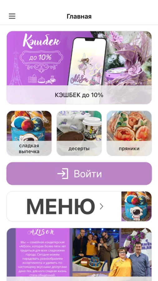 Также, помимо разнообразных десертов, тортов, выпечки и пряников, сделанных из высококачественных продуктов, вас ожидает информация об акциях, розыгрышах и промокодах. Приятным бонусом для всех пользователей мобильного приложения станет КЭШБЭК до 10% на продукцию семейной кондитерской «AliSon».