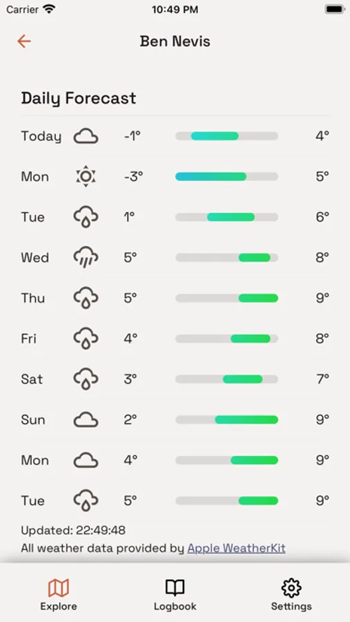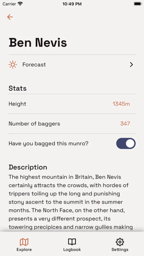 Munro Bagger allows you to easily record your bagged munros and keep track of your progress. You can also view a 10 day forecast for each Munro to help plan your trips and ensure you're prepared for the weather conditions.