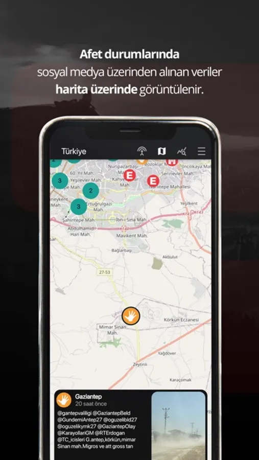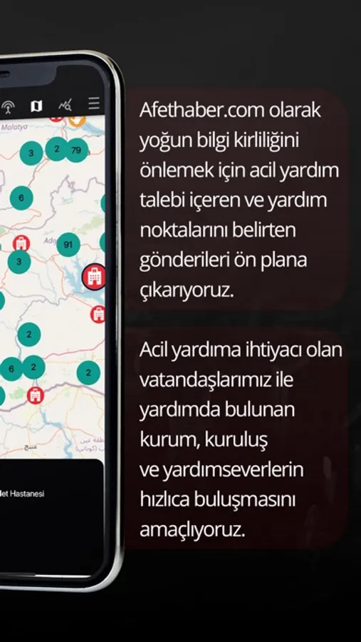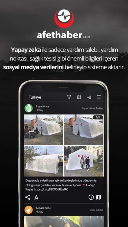 Afet durumlarında sosyal medyadan çekilen verilerin yapay zeka ile işlenerek anlık konum bazlı yardım noktalarını, yardım taleplerini ve sağlık tesislerini harita üzerinde görüntüleyen bir uygulamadır.