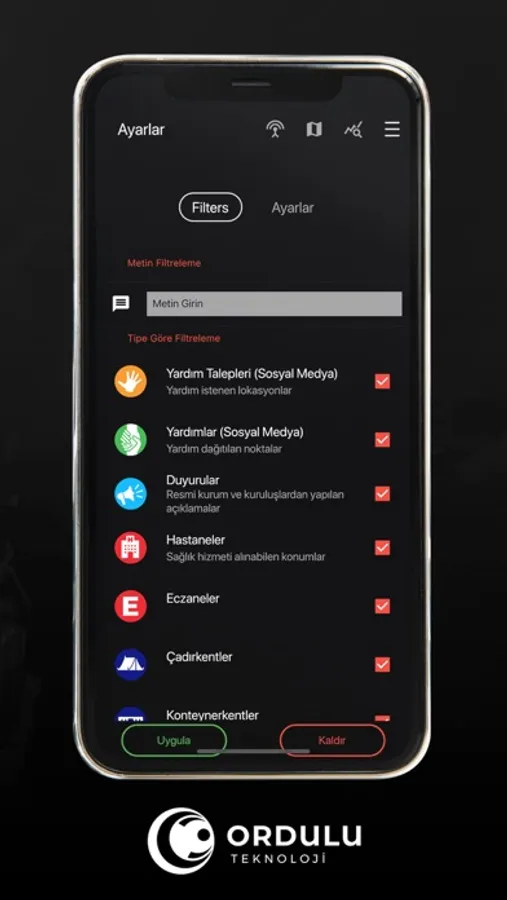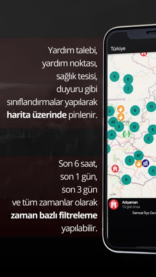 • Yardım talebi, yardım noktası, sağlık tesisi, duyuru gibi sınıflandırmalar yapılarak harita üzerinde pinlenir.