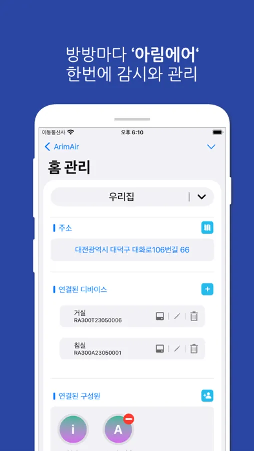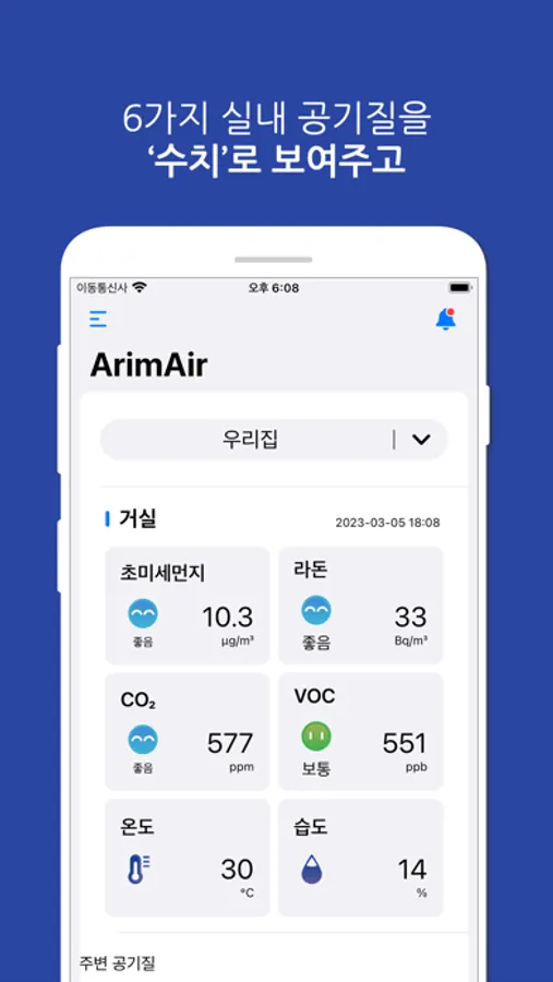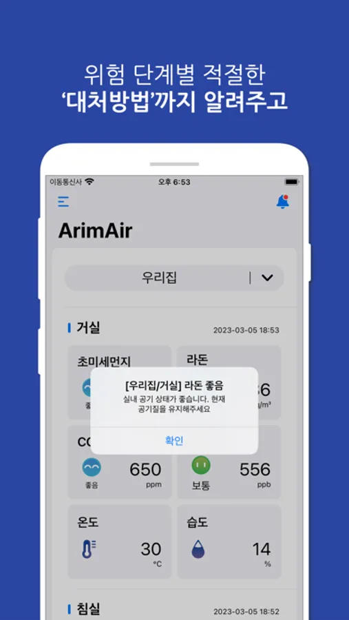 실내 공기, ‘감’으로는 제대로 관리할 수 없어요. 6가지 실내 공기 요소를 정확하게 측정하고, 위험 단계별 대처 방법까지 알려주는 [아림에어]로 관리하세요!