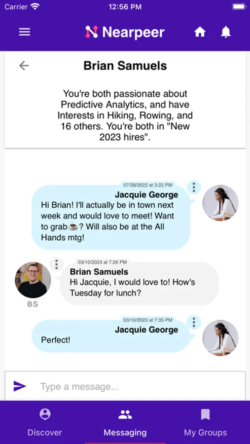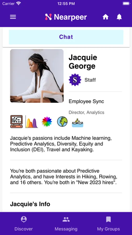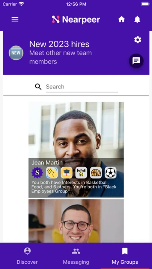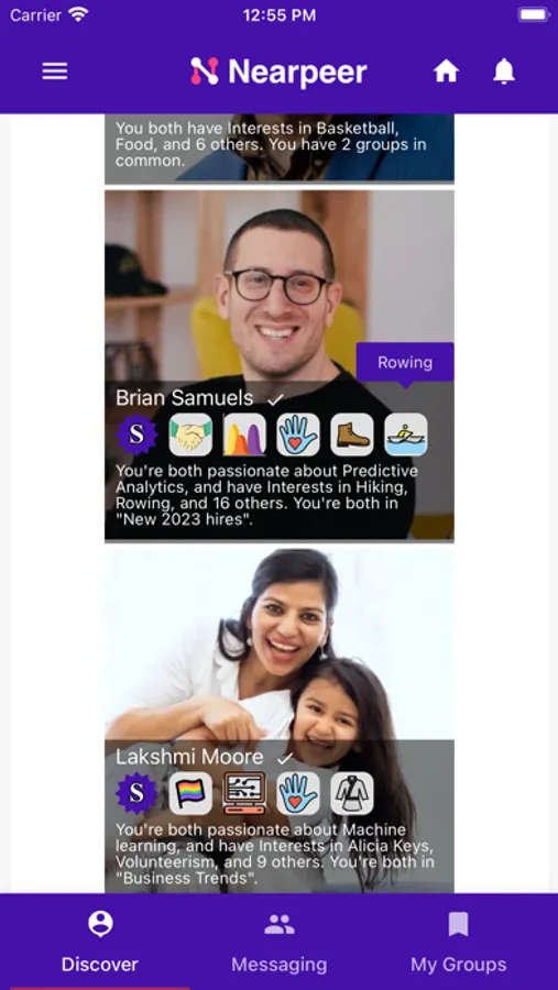 Discover what you have in common with your work peers as a way to get to know each other better. Nearpeer’s peer matching algorithms show you what you have in common with your colleagues, such as work topics, interests, passions, life experiences, hometown, and more!