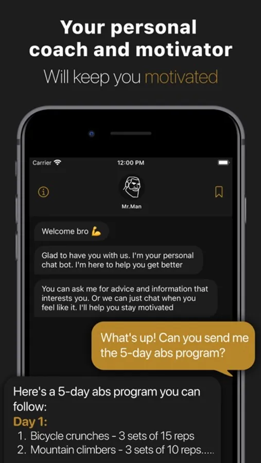 Chat with Mr.Man — is a trained neural network that is always at your fingertips. He will always be happy to talk to you, find the information you need, motivate you, make a training program, talk to you as a friend about anything.