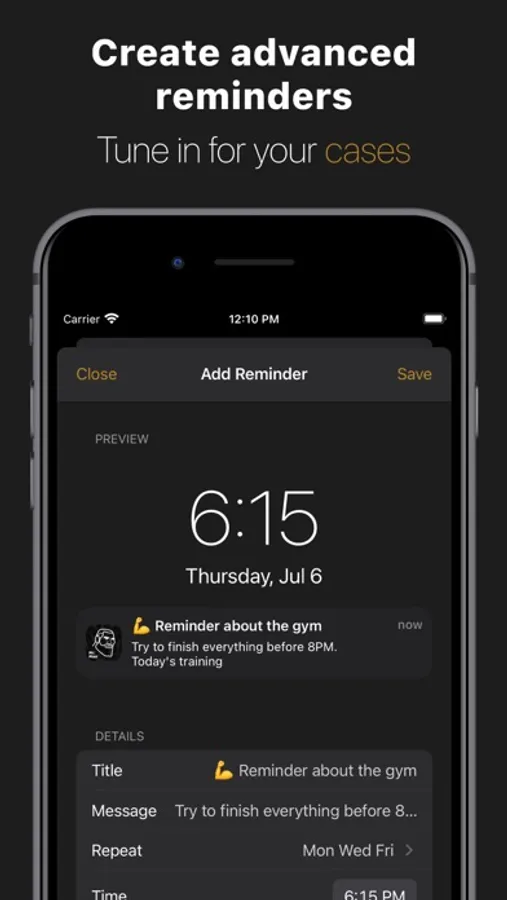 Reminders — a convenient way to create reminders without leaving the application, we have developed a unique UI/UX, where you can see how your reminder will look like before you create them. It's also possible to include a motivating auto notification from Mr.Man