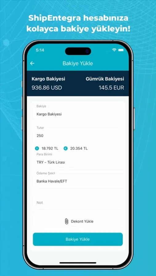For your cargo balance payments (Dollars) and customs balance payments (Euros), you can easily top up your balance with Wire Transfer/EFT/Payoneer or Credit/Debit Card. You can check your Cargo and Customs balance history.