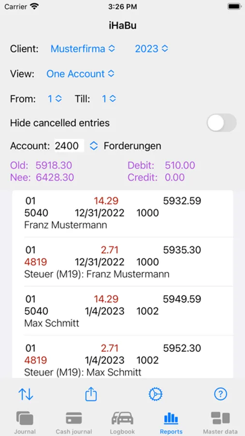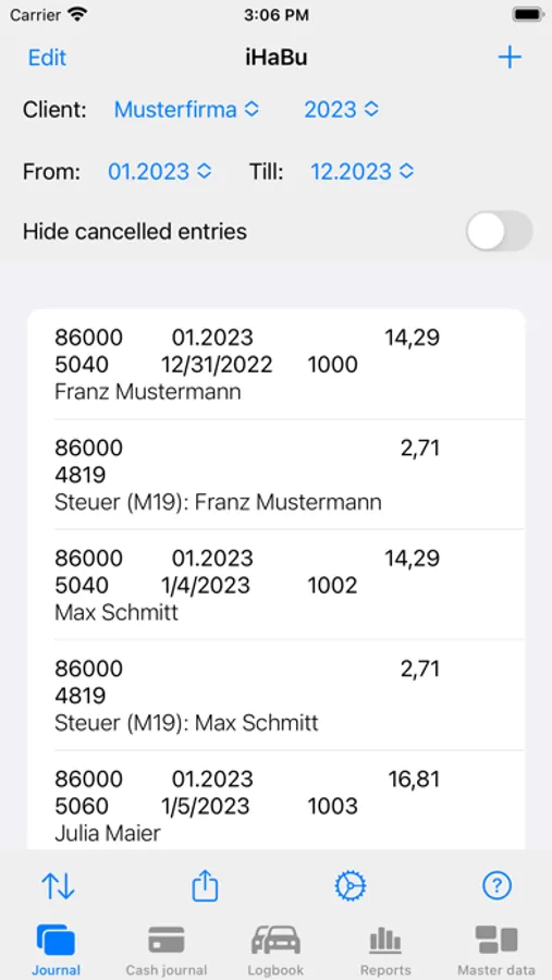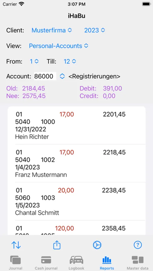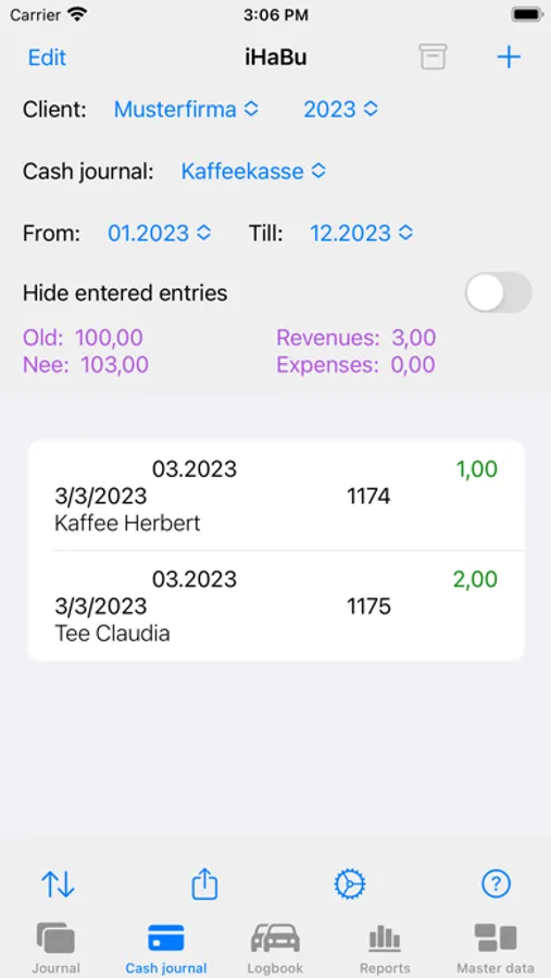 You can enter values directly in the journal or in one of the user-defined cashbooks. And to display the values, there are various reports. Independent of the above functions, there is a driver's logbook.