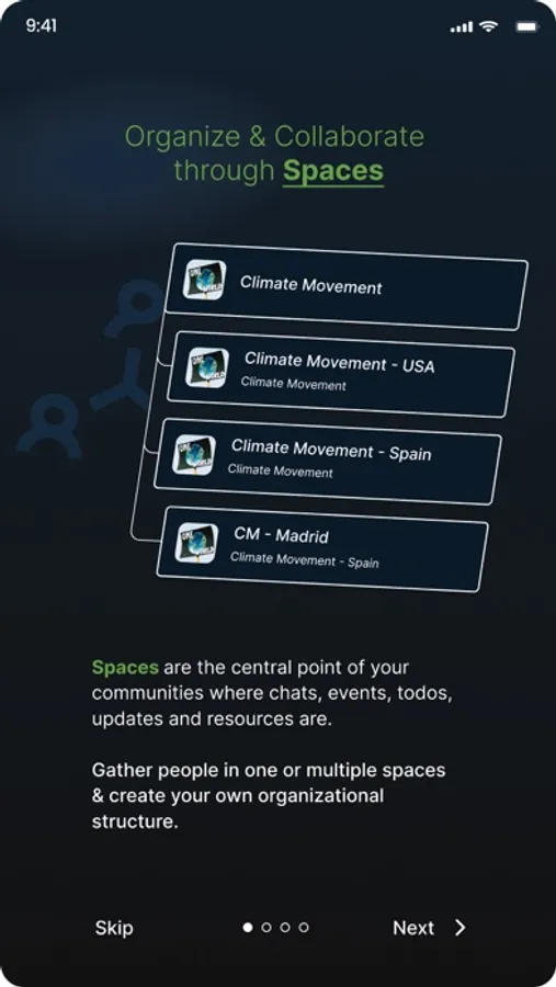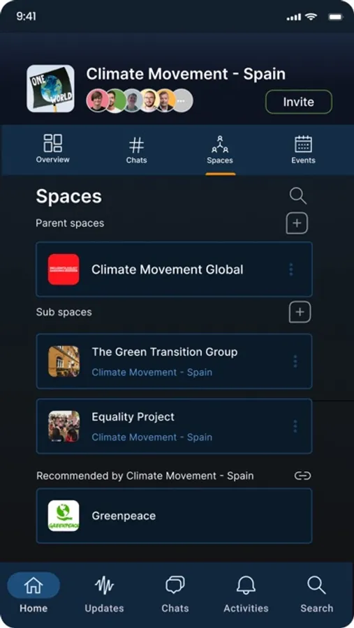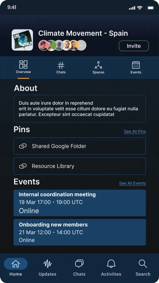 Spaces are the central point of your communities where chats, events, todos, updates and resources are.