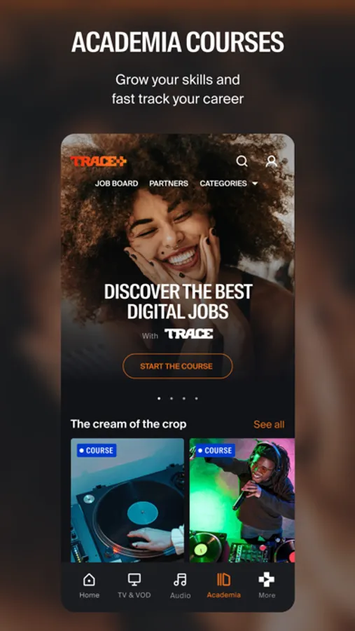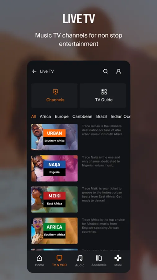 Welcome to Trace+, your access to Afro culture worldwide. Trace+ offers you a unique music and video experience with a variety of content: play live TV, concerts, interviews, movies, video, live FM, music player, podcast and digital radio, as well as e-learning with Trace Academia. Whether you're looking to entertain yourself or succeed, Trace+ is the ideal destination.