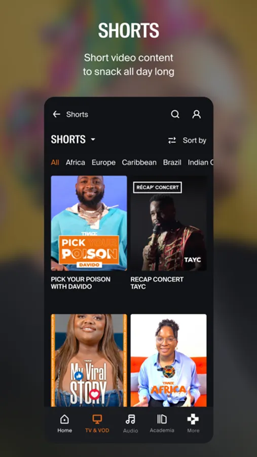 With Trace+, access all 25 Trace TV channels live (Trace Urban, Trace Africa, Trace Naija, Trace Gospel, Trace Mziki, Trace Ayiti, Trace Caribbean, etc.), available for video streaming anytime for Premium members. Enjoy streaming video interviews with your favorite music artists, play movies and shows that celebrate the diversity of Afro Culture. Explore the VOD section to (re)discover exclusive on-demand programs: video mixes, movies, concerts, fitness sessions from home, and more. Don’t miss the SHORTS video section, with short formats on the latest trends and information — it’s fresh, it’s cool, and it’s 100% free!