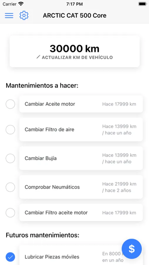 Le ayudamos buscando automáticamente productos y recambios para realizar mantenimientos y servicios como cambio de aceite, cambio de líquido de frenos, cambio de filtro, cambio de bujía, neumáticos o cadena de transmisión. Cuando cree un vehículo se le generará automáticamente los recambios de componentes del vehículo o reparaciones del vehículo.