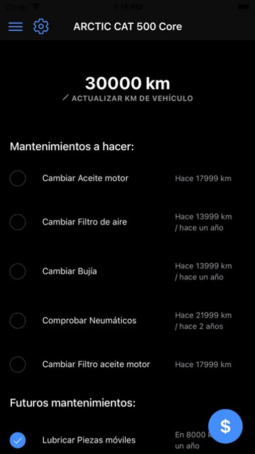 Cambio de aceite, revisión de frenos, neumáticos, filtros, cambio de bujía, revisión general; Todos estos servicios pueden verse fácilmente con esta aplicación para el automóvil, a modo de agenda para el vehículo. Cuando el conductor realiza un mantenimiento del vehículo o reparación, esta aplicación le indica la siguiente vez que debe realizar el mantenimiento o reparación del vehículo. El conductor también puede ingresar los gastos y servicios realizados, esta es una herramienta muy útil para ver todo el mantenimiento realizado en el vehículo.
