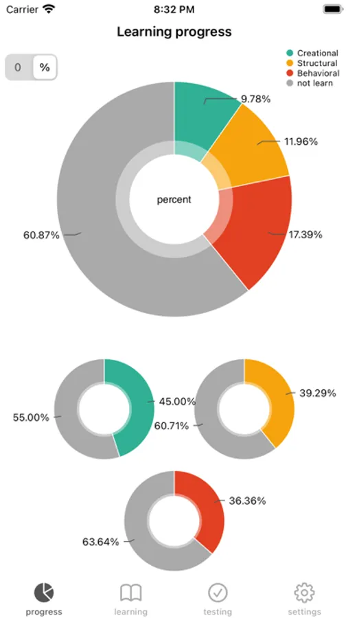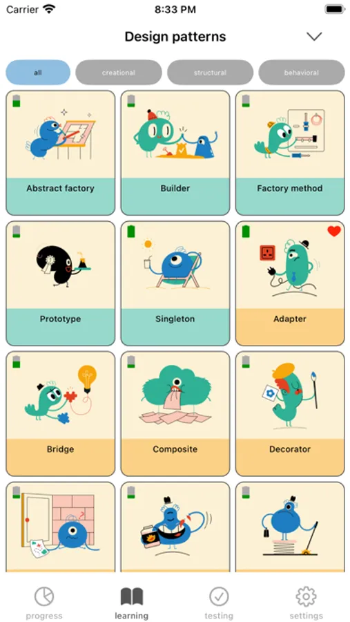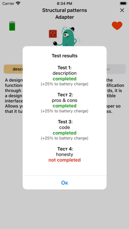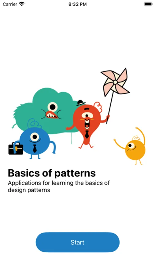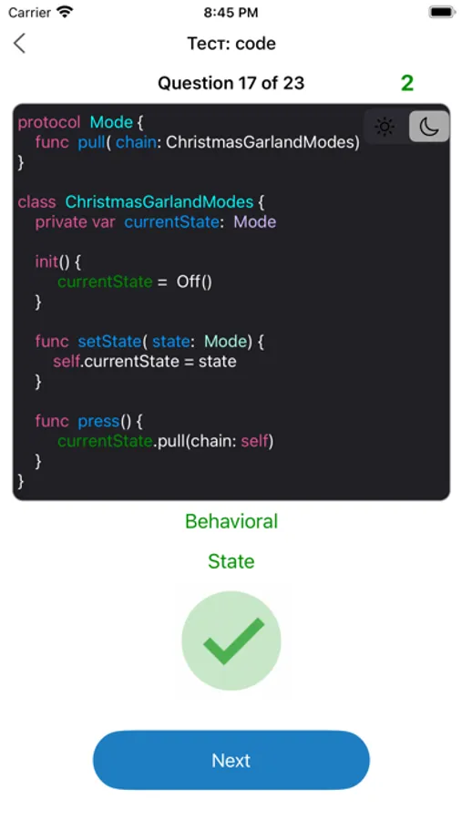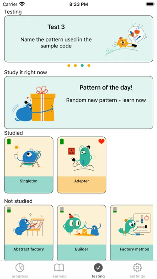 The application contains a short reference guide with examples in the swift programming language, several types of testing to assess knowledge and monitor learning progress. It is provided to save your favorite patterns.