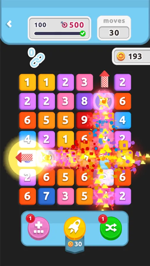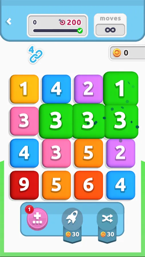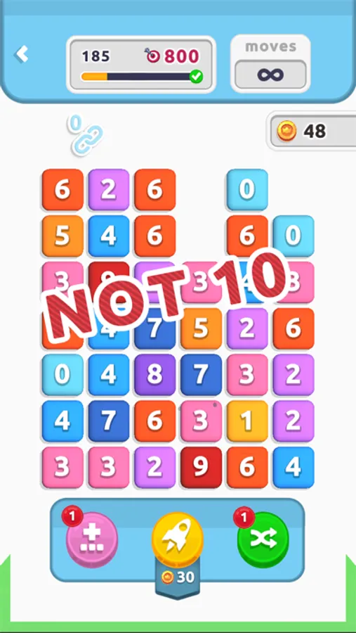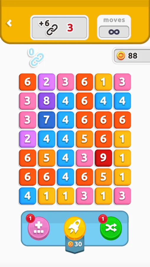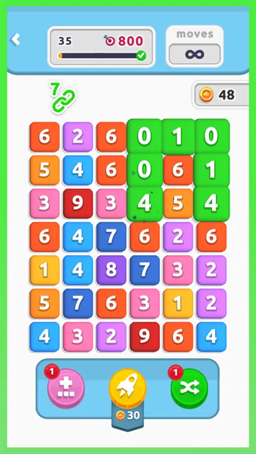 Find all sums of 10: the more numbers linked, the better the score, the greatest the explosions. Reach several goals: score, Big Chains, breaking tiles, collecting gems, in a limited number of moves or not.