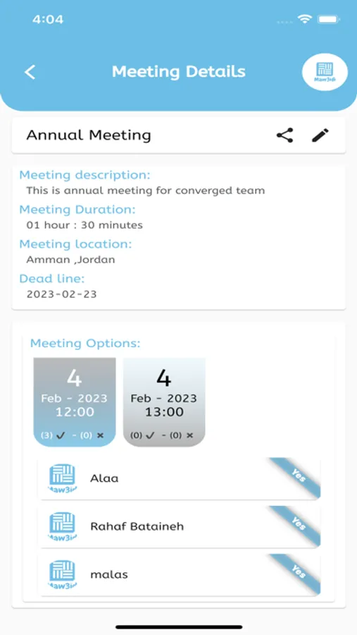 But we don't stop there! We believe in empowering collaboration and decision-making among participants. That's why Mow3idi incorporates a unique voting system. Once you've created the meeting with multiple time options, you can easily share it with your friends, colleagues, or teammates using Mow3idi. Each participant can then vote for their preferred time slot, expressing their availability and preferences.