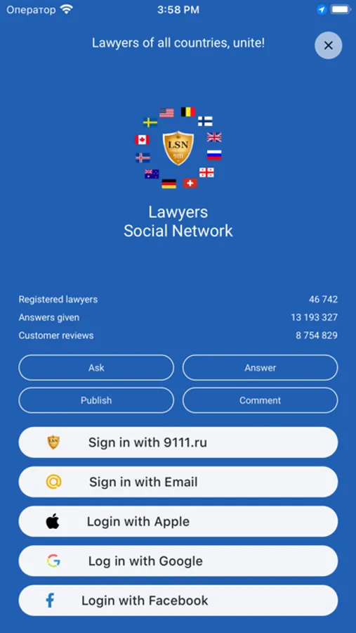 More than 40 thousand lawyers from more than 100 countries have already been registered in the LSN mobile application. LSN lawyers answer users' questions for free and have already given more than 14,000,000 answers, which can be found in the application database. For convenience, all questions and answers are grouped in chats by topic.