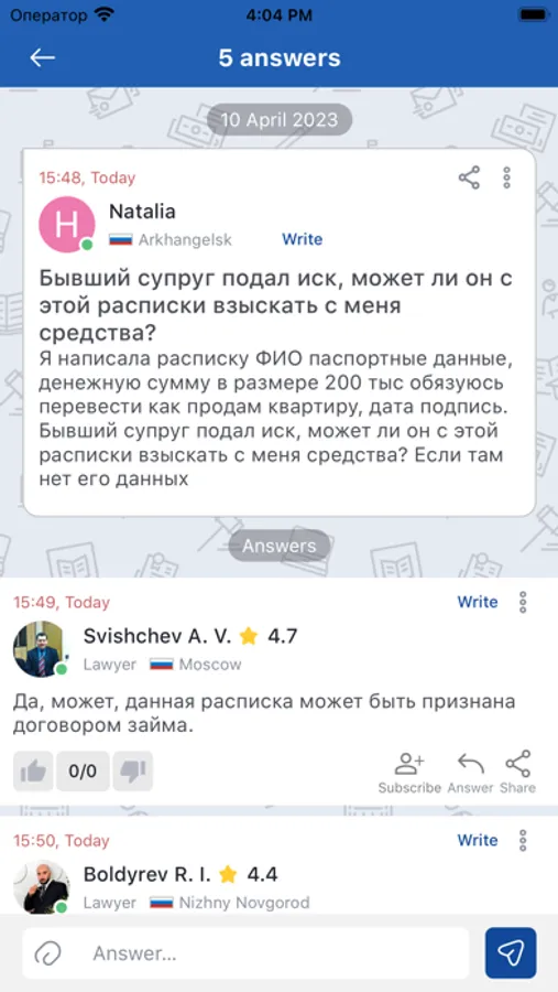 If you are in a difficult situation and you need a lawyer's advice, then you have come to the right place. In the LSN application, the user can ask a question of interest to him completely free of charge. According to statistics, lawyers answer 80% of questions. Almost all questions that are clearly formulated receive a free answer from one or more lawyers.