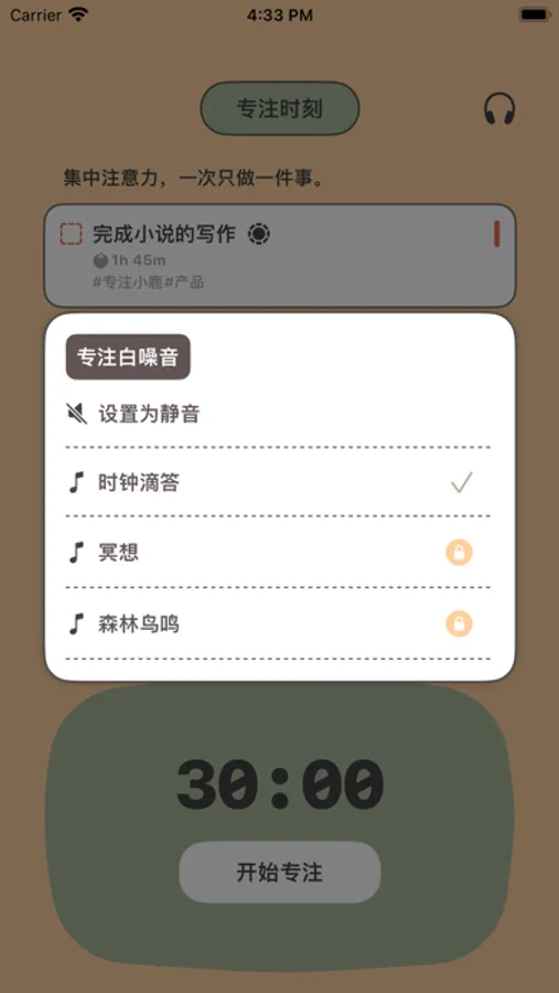 优美的白噪音:提供多种舒缓、自然的白噪音,帮助用户更好地专注,提高工作效率和品质。