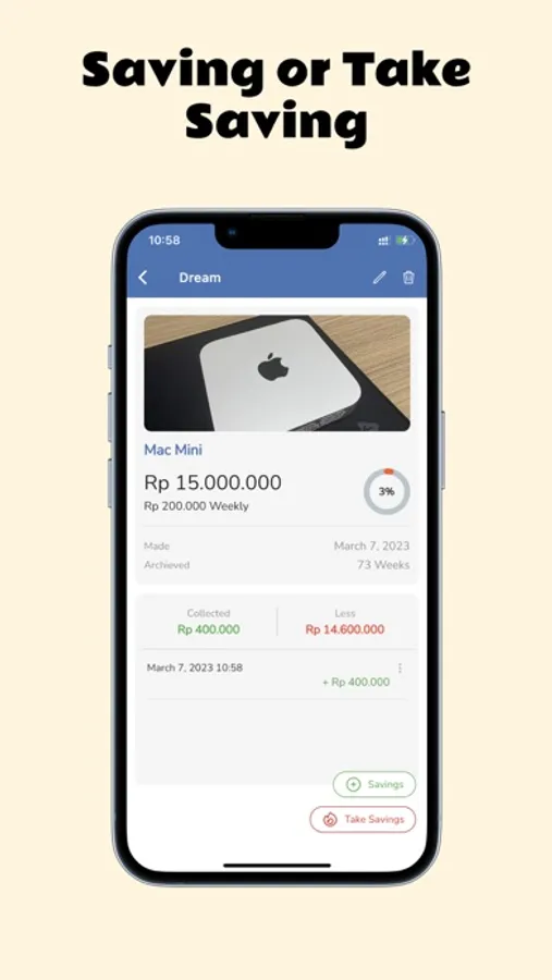 Dream Savings is an application that helps record the progress of savings. Equipped with saving features, taking savings, pin codes, backups and various currency options.