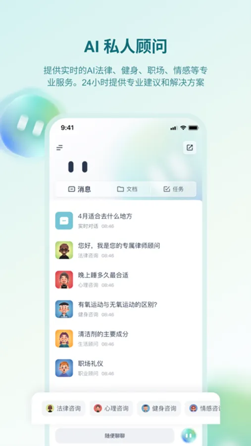 1.AI私人顾问 提供实时的AI法律、健身、职场、情感等专业服务。24小时提供专业建议和解决方案。