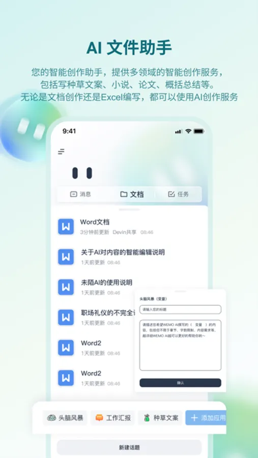 2.AI文件助手 您的智能创作助手,提供多领域的智能创作服务,包括写种草文案、小说、论文、概括总结等。无论是文档创作还是Excel编写,都可以使用AI创作服务。