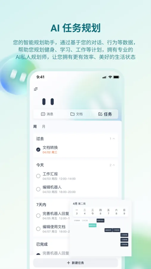 3.AI任务规划 您的智能规划助手,通过基于您的对话、行为等数据,帮助您规划健身、学习、工作等计划,拥有专业的AI私人规划师,让您拥有更有效率、美好的生活状态。
