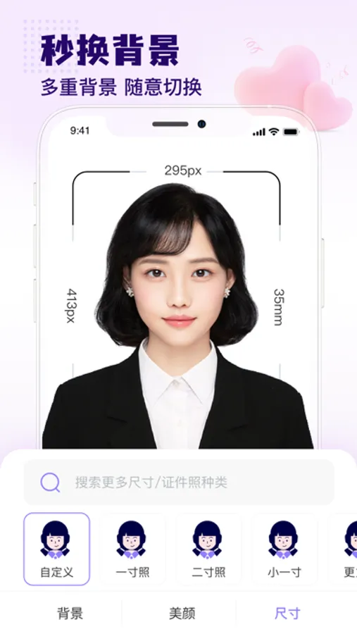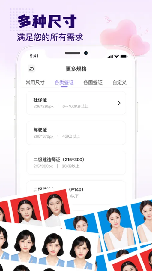 尺寸齐全:除了支持常用的一寸照、二寸照等,还支持会计从业证和教师资格证等证件照片,制作证件照更快捷更高效;