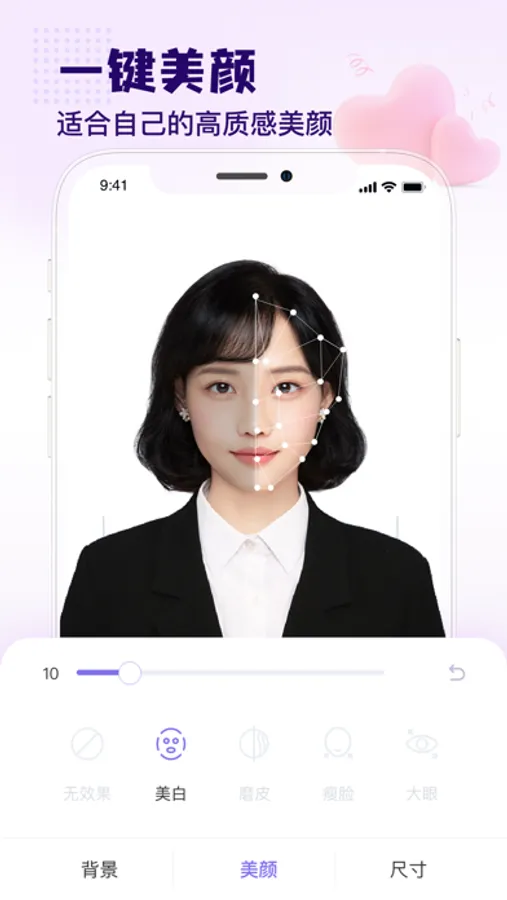 智能美颜:然美肤美颜的算法,美白、美肤、换背景,制作完美证件照,就是那么简单;