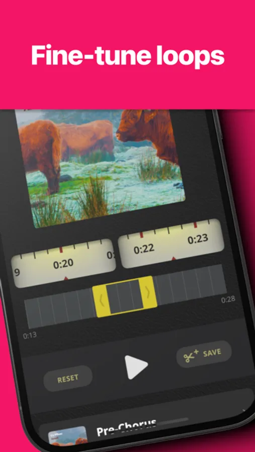 Just drag the yellow handles to select any part of a song. Then use precision dials to fine-tune the start and end points. Slowify will seamlessly loop each verse, chorus, and solo until you're playing perfectly in time, at whatever tempo you choose.