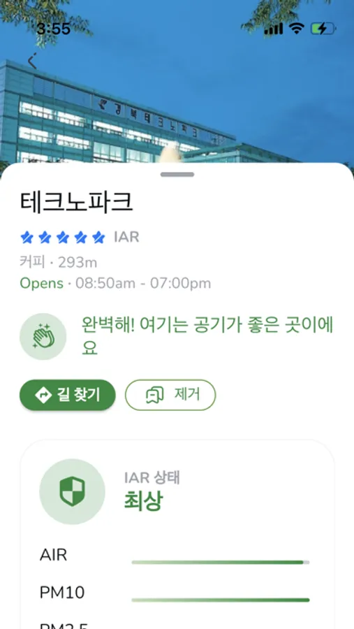 어플리케이션 이용자들의 API를 수집하여 이용자들 주변의 유치원, 카페, 식당 등의 실시간으로 실내공기질을 파악하여 쾌적한 실내 공간 라이프를 선택할 권리를 주고 해당 업장에 대한 기본적인 위치, 전화번호, 영업시간에 대한 정보를 제공한다. 추가적으로 검색으로 원하는 곳의 실내공기질 정보도 파악할 수 있다.