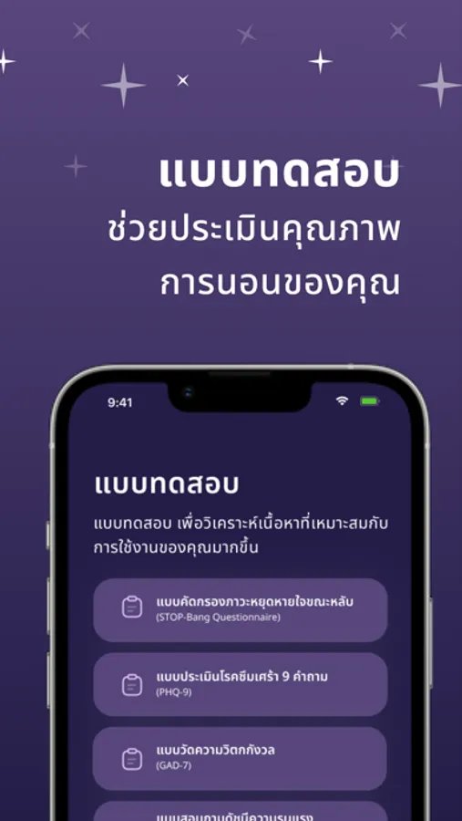 4. แบบทดสอบ ผู้ใช้งานสามาเข้าไปทำแบบทดสอบเกี่ยวกับการนอน เพื่อให้ผู้ใช้งานสำรวจพฤติกรรมการนอนและประเมินความเสี่ยงของตนเองได้