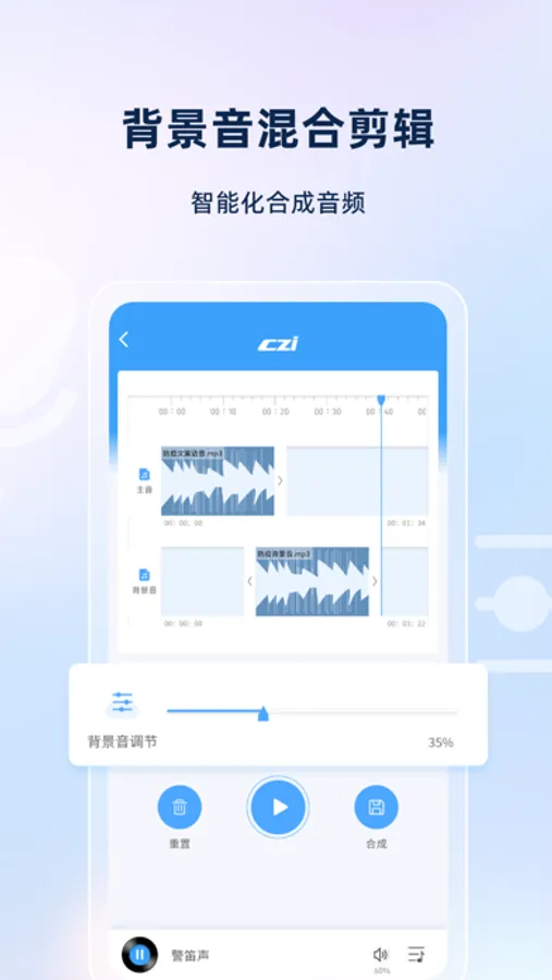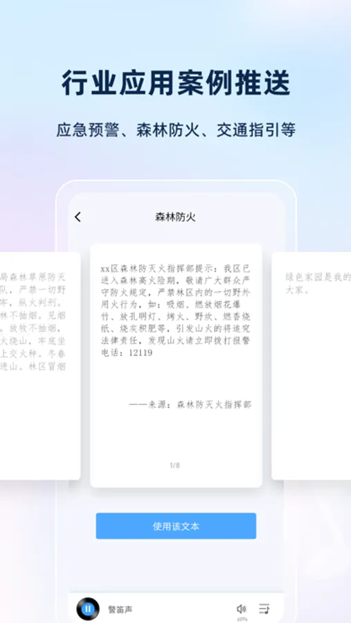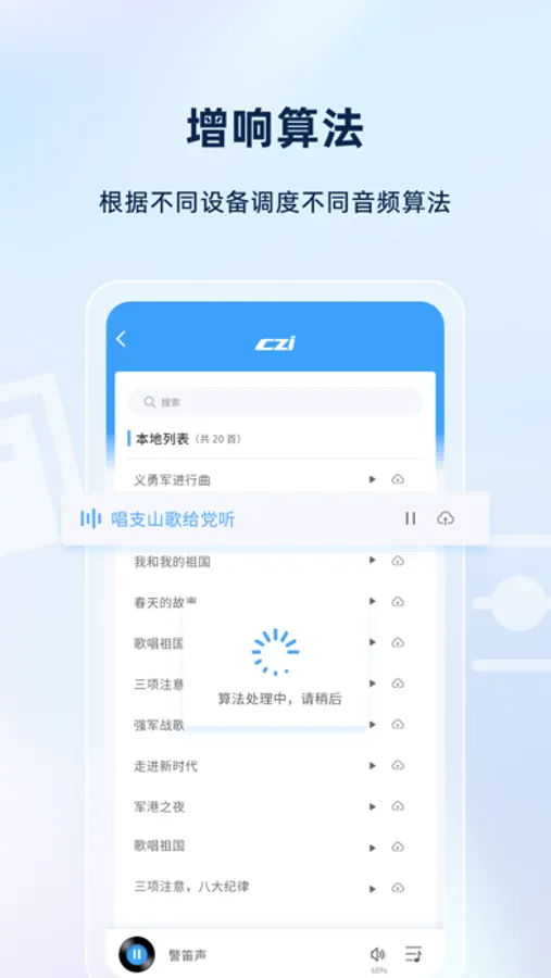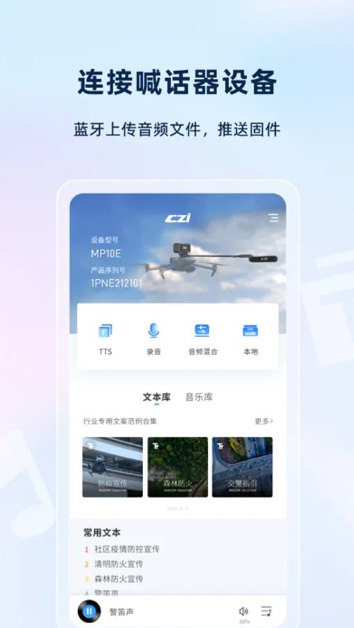智声将音源文件(TTS、录音、混合音频)用增响算法处理,然后通过蓝牙上传到喊话器。也可以推送固件和行业应用的最新广播内容、地面近距离控制喊话器播放歌曲等