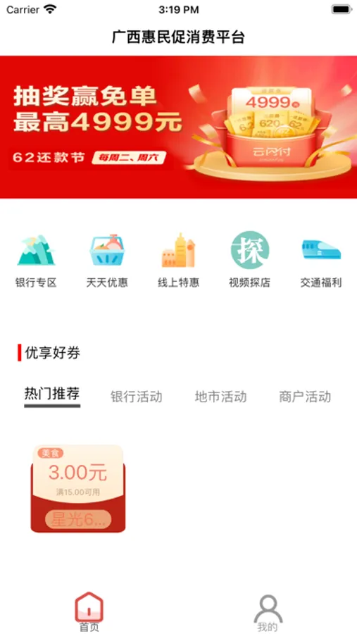 广西惠民促销费平台可领取美食、加油等行业优惠券。用户可查看附近商家活动,发现附近优惠。