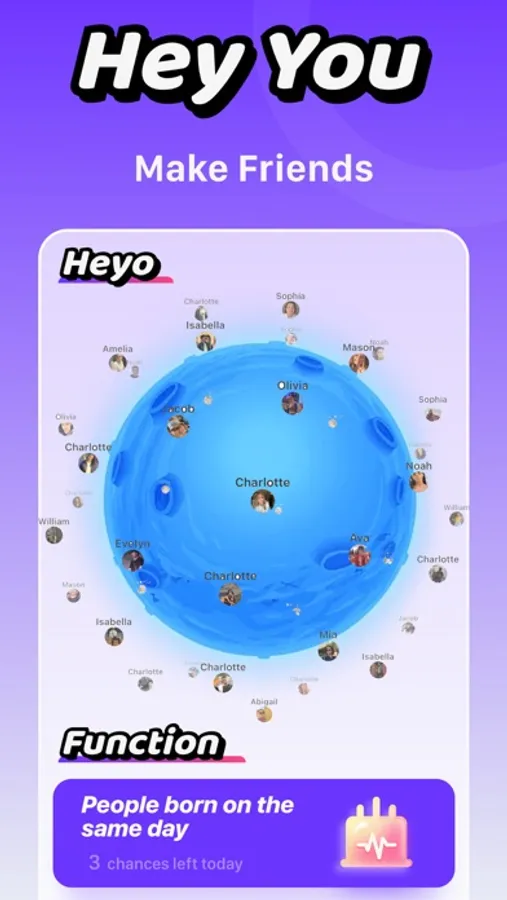 Want to meet new friends, people with the same birthday? Just start making new friends from all over the world on Heyo!