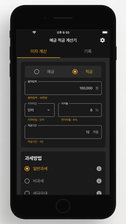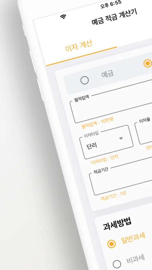 - 예치금액, 월적립액, 이자율, 이자타입, 적금기간, 예금기간과 과세 방법을 입력할 수 있습니다.