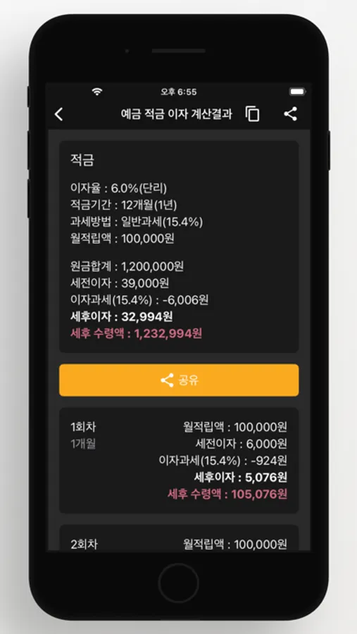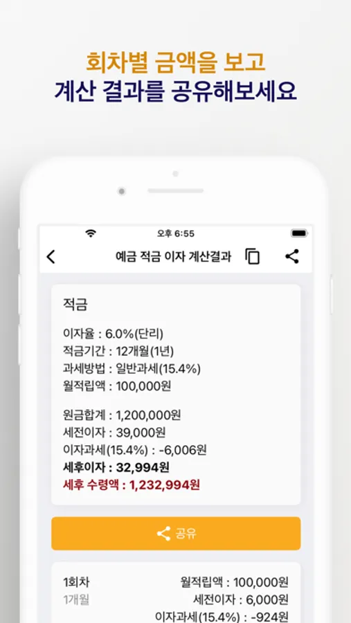 - 회차별로 세전이자, 세후이자, 이자과세, 세후 수령액을 확인할 수 있습니다.